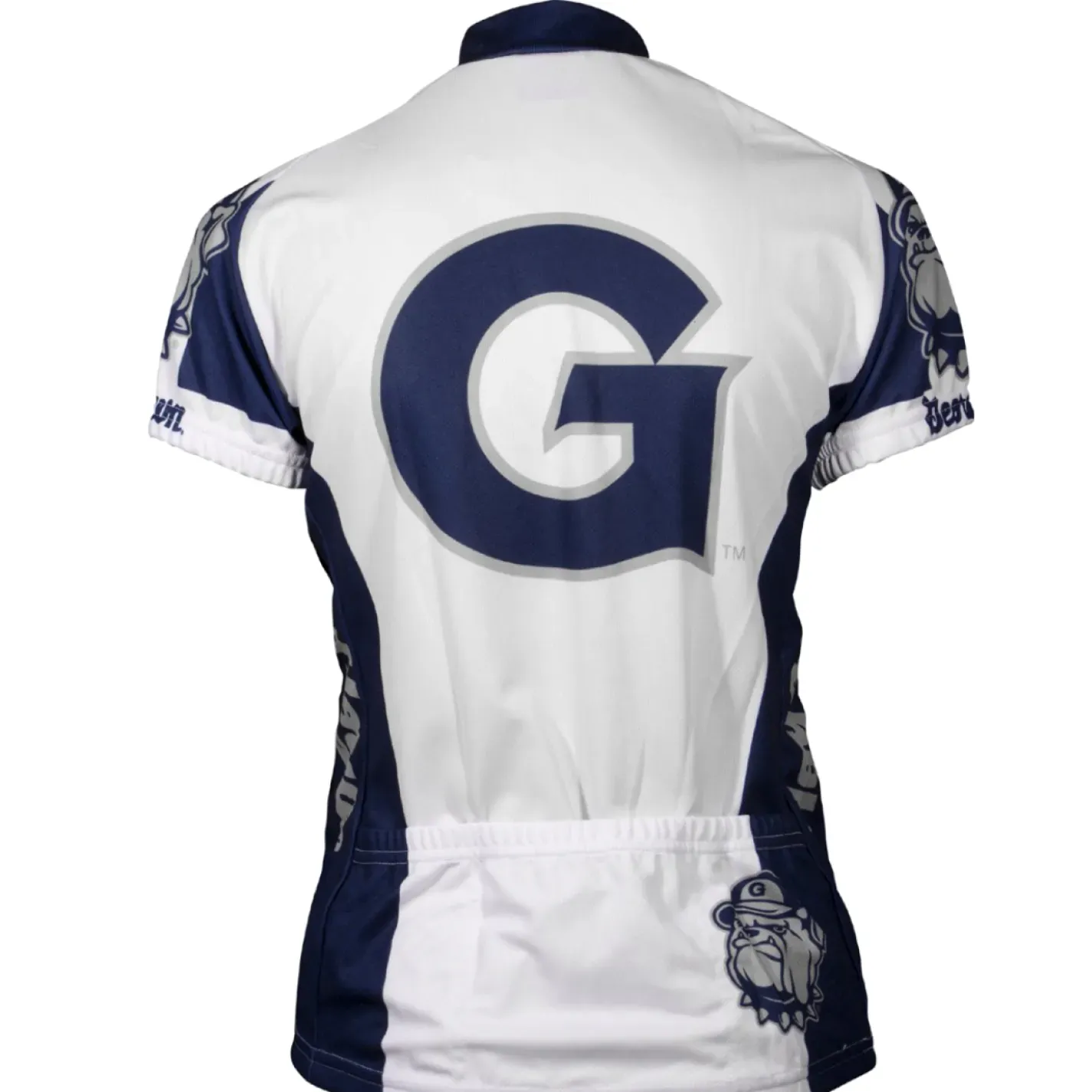 This Women’s Georgetown College cycling jersey offers a classic look with navy blue and white colors. The large “G” logo and mascot emblem add team pride to the design.
