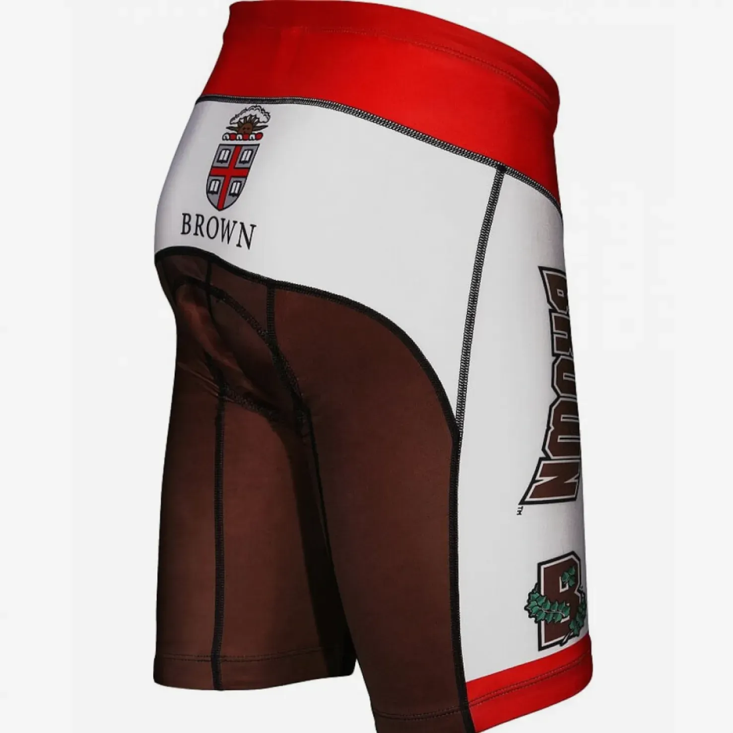 These Brown University cycling shorts feature a bold color-blocking design with white, red, and brown panels. The front displays the university name in an arched style font. These athletic shorts are constructed with elastic leg grippers to keep them securely in place during your ride.