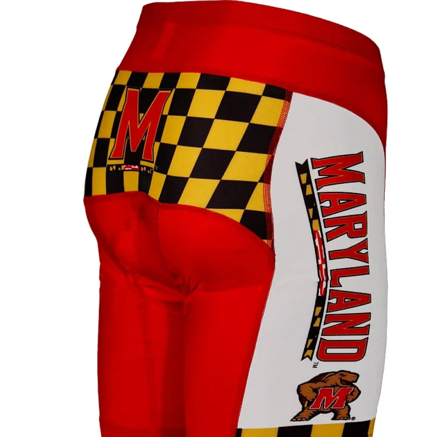 Show your school pride with these team cycling shorts, featuring bold “MARYLAND” lettering and a mascot logo. The design includes red panels, a checkered pattern on the legs, and a padded crotch for comfort during rides.