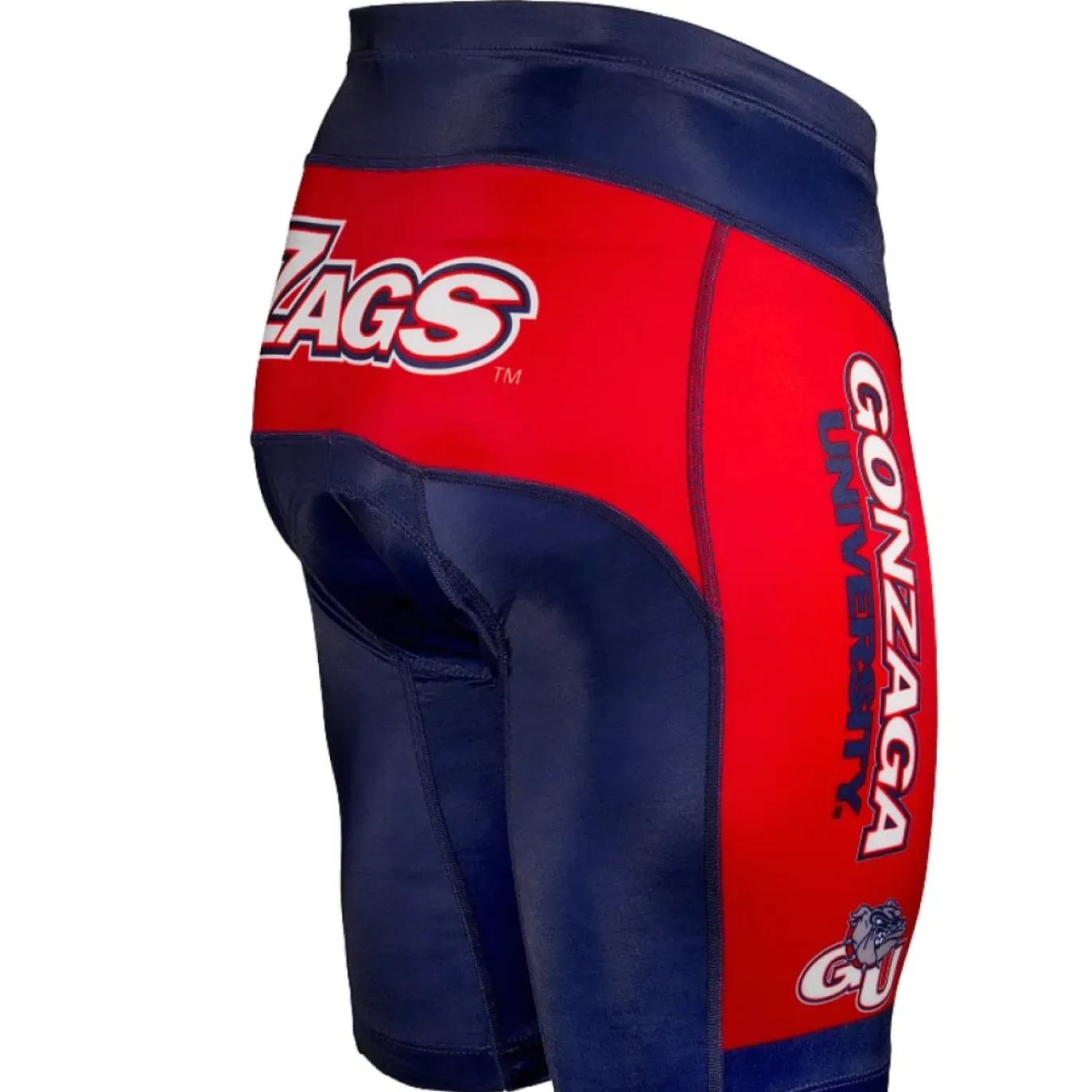 These Gonzaga University cycling shorts feature a bold red and navy design with prominent collegiate branding. The athletic cut is tailored for comfort during rides, showcasing team spirit with clear school logos and graphics.
