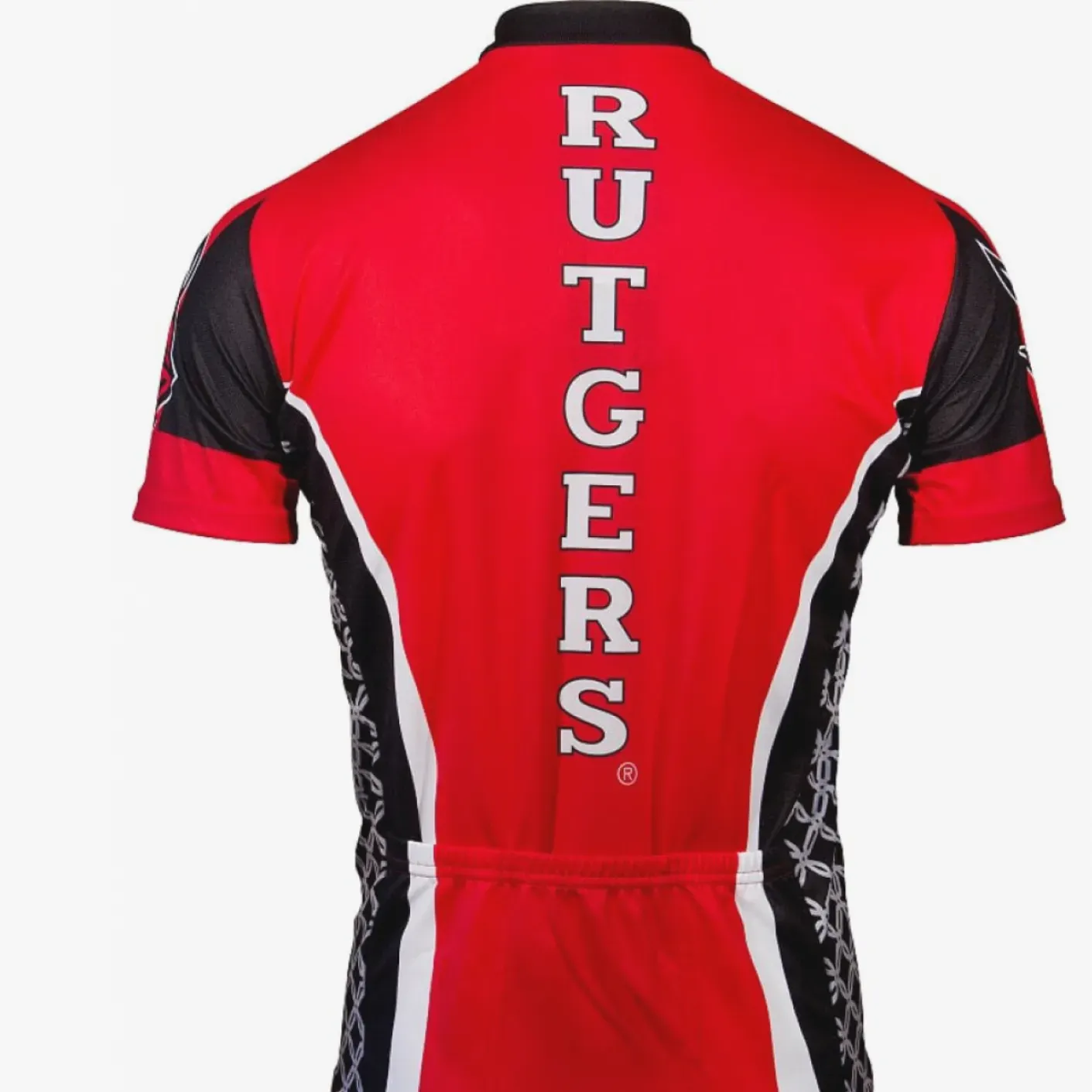 Show your school pride while cycling with this Men’s Red Rutgers University Bicycle Jersey. Designed for performance and comfort, it features a bold “R” logo, black and white accents, and full sublimation printing for a vibrant, long-lasting look.