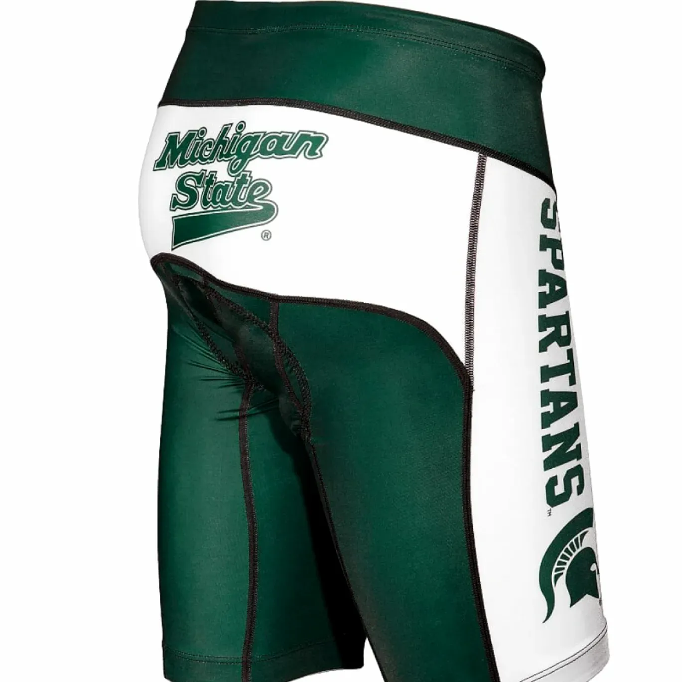 Show your team spirit with these Michigan State Spartans cycling shorts. Featuring a distinctive green and white color scheme, the design is accented by a large, vertical “SPARTANS” logo and Spartan helmet emblem on the leg.
