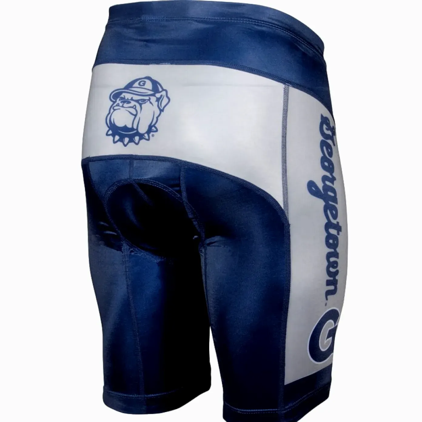 Show your team pride with these official Georgetown Hoyas college cycling shorts. The men’s fit design features a navy blue and light gray color scheme, highlighted by a prominent “Georgetown” text on the leg.
