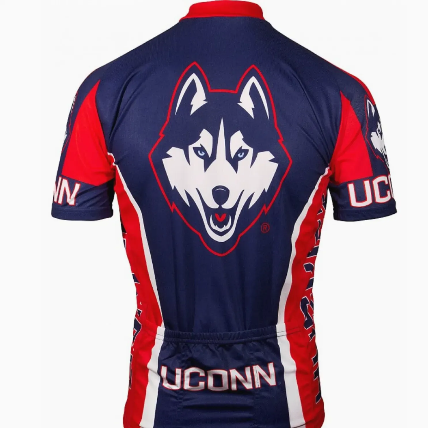 This collegiate cycling jersey represents the UCONN Huskies with pride. Featuring a bold navy blue base, vibrant red side panels, and iconic team branding, it is designed for both die-hard fans and serious cyclists.