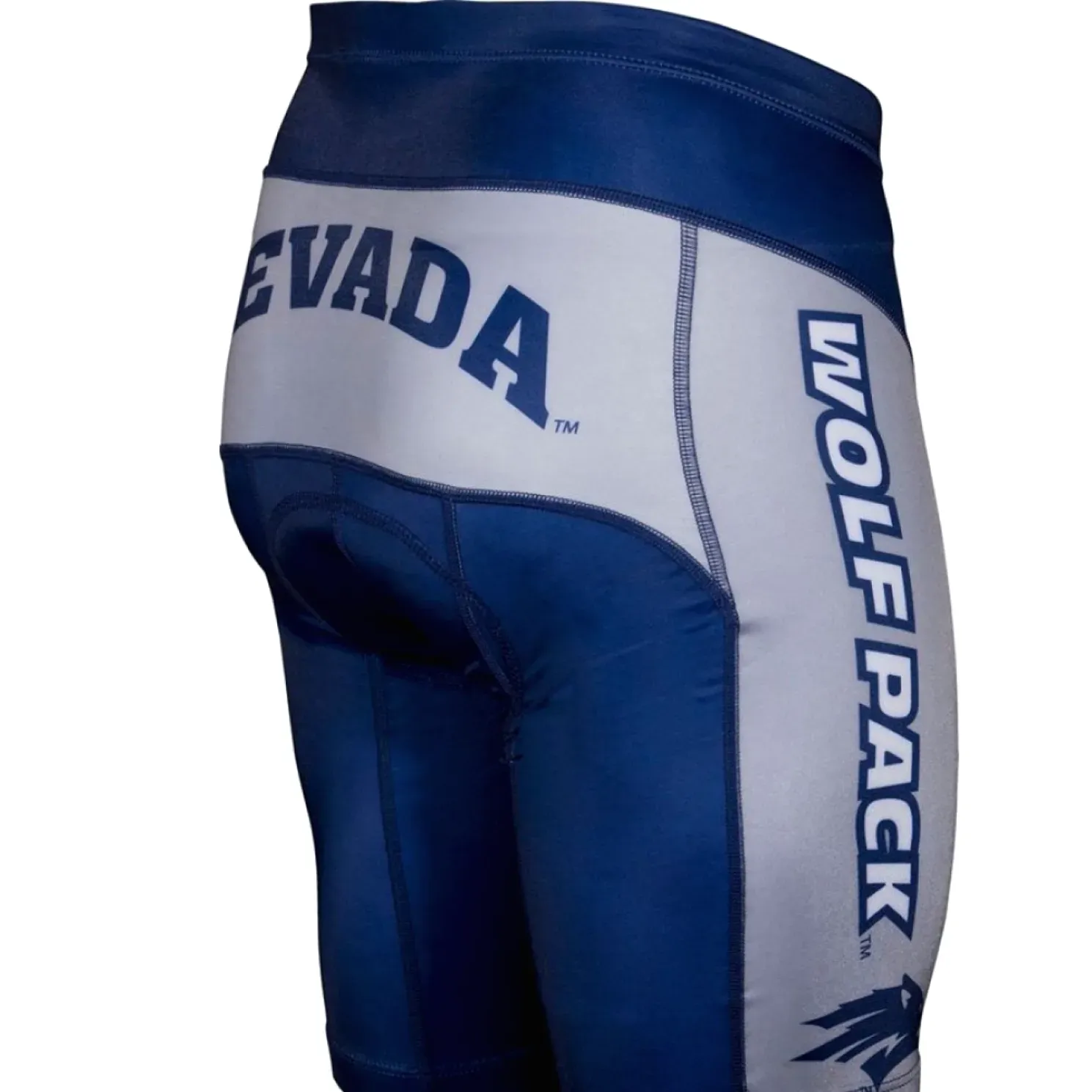 The Unisex Wolf Pack Nevada Reno College Bike Shorts feature a bold design with navy blue and grey panels. They are designed for comfort while cycling, offering an athletic fit that accommodates standard riding positions without excessive restriction.