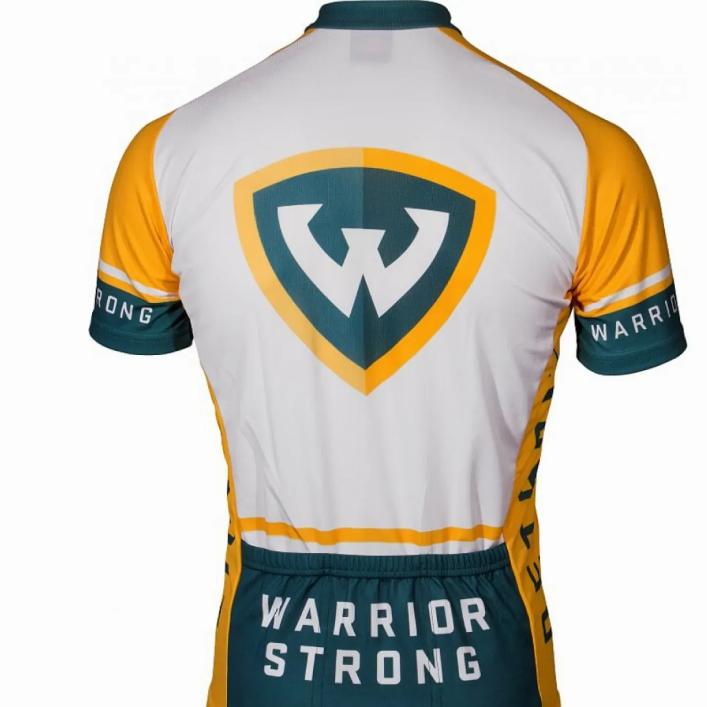 This Wayne State cycling jersey is an athletic short-sleeve option designed for performance and style. The classic color scheme features a white body paired with vibrant yellow shoulders and sleeves, accented by deep green detailing. It includes prominent team lettering down the side and on the sleeve cuffs to complete the official look.