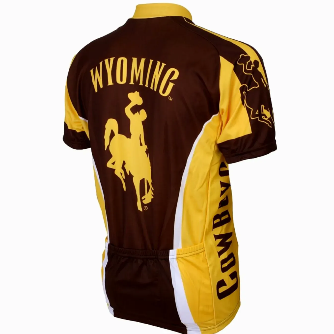 Show your Wyoming Cowboys pride with this classic cycling jersey. The design features a bold brown body with yellow side panels and full-color team graphics, including the iconic horse-rider logo. It’s perfect for casual rides or representing your college team at local events.